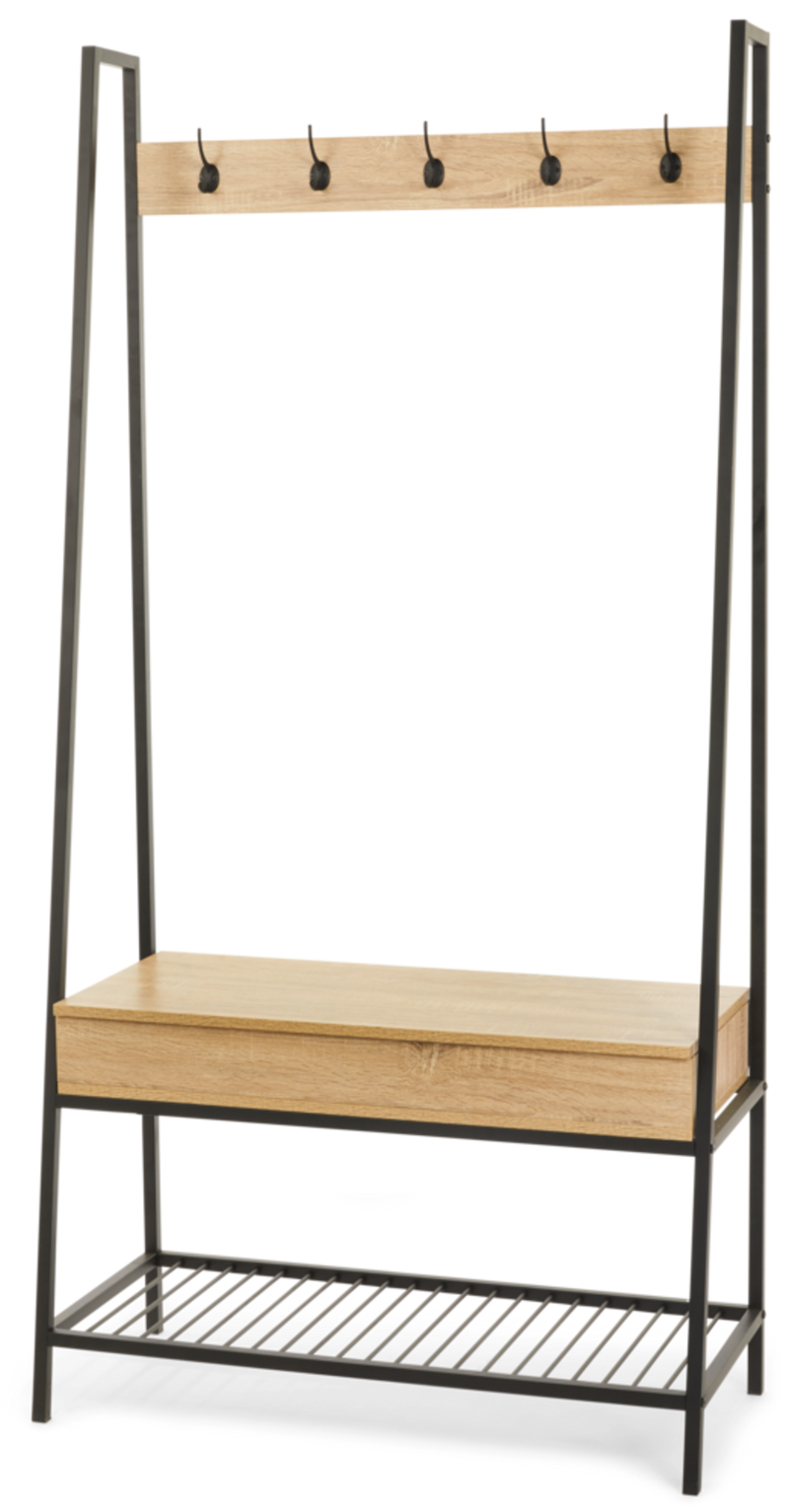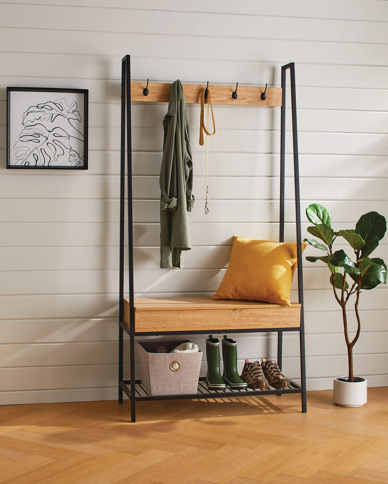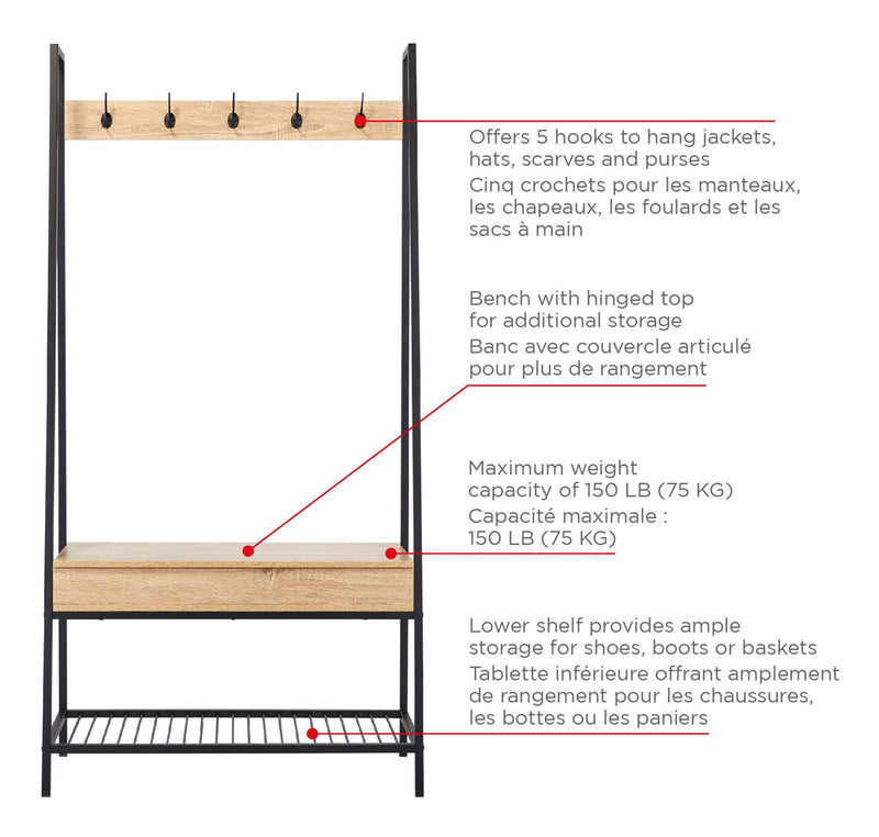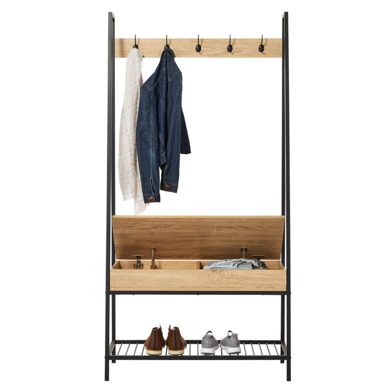 The CANVAS Langham Hall Tree With Storage Bench & Shoe Rack is an ideal solution for organizing your entryway or mudroom. The hooks at the top easily hold your jackets, hats, and other accessories with ease. Below the hooks is a seat with a lift-up top, which gives you a place to sit and tie your shoes, while also offering additional storage. Made to last, this practical hall tree also comes with a bottom rack for your shoes, boots, and sandals or baskets.